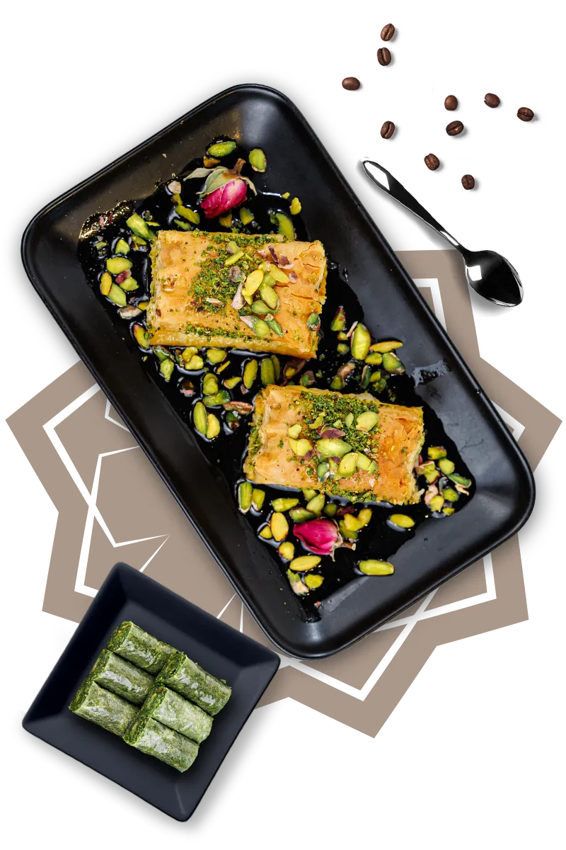 • A wide selection of freshly made baklava, knafeh, maamoul, basbousa, and more